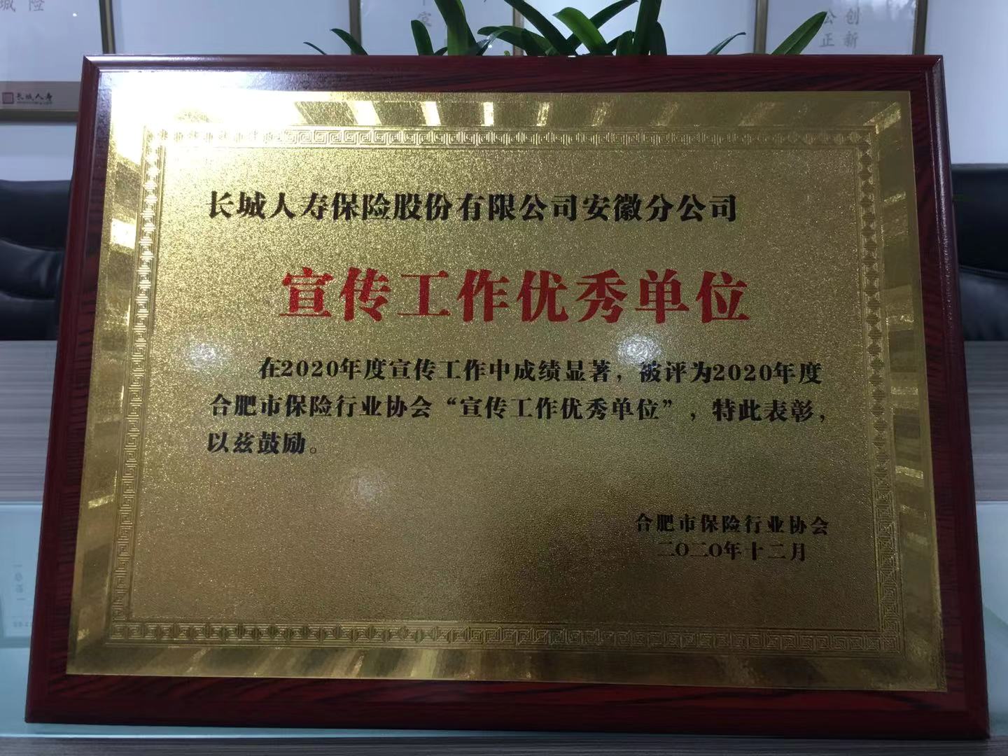 新闻来源:长城人寿    日期:2020-12-26          12月22日,在合肥市保险行业协会主办的2020年宣传工作会议暨表彰大会上,安徽分公司获评“2020年度信息宣传工作优秀单位”。