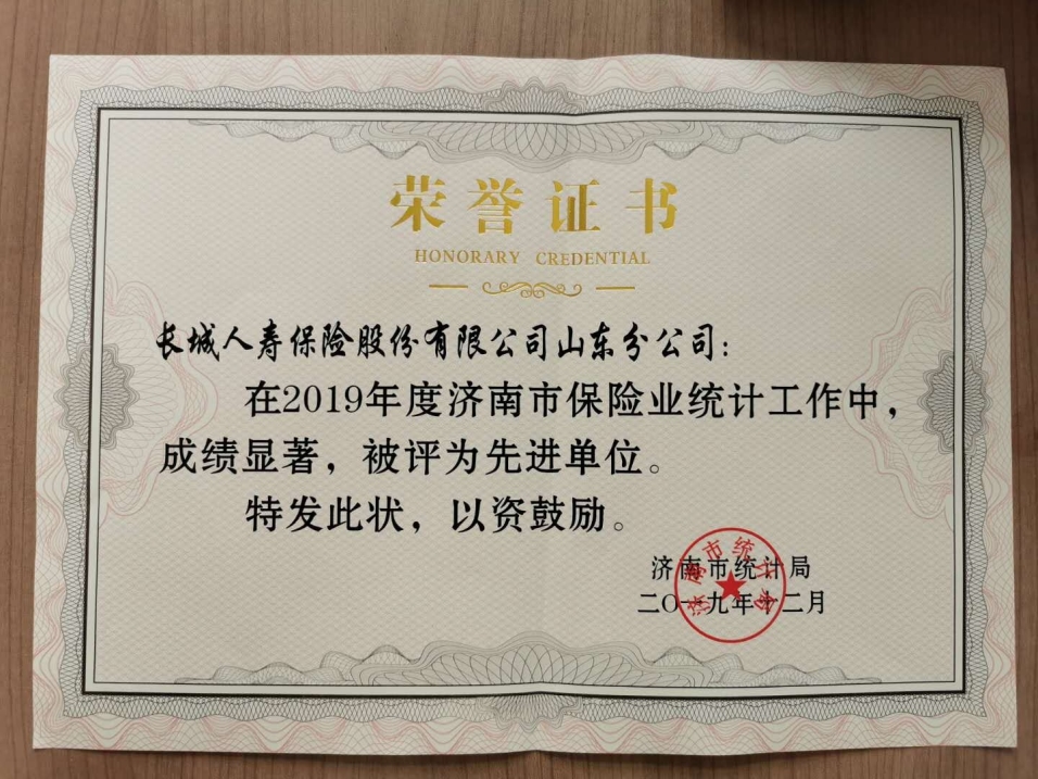 4月1日,山东分公司被济南市统计局评为2019年度济南市保险业统计工作先进单位。