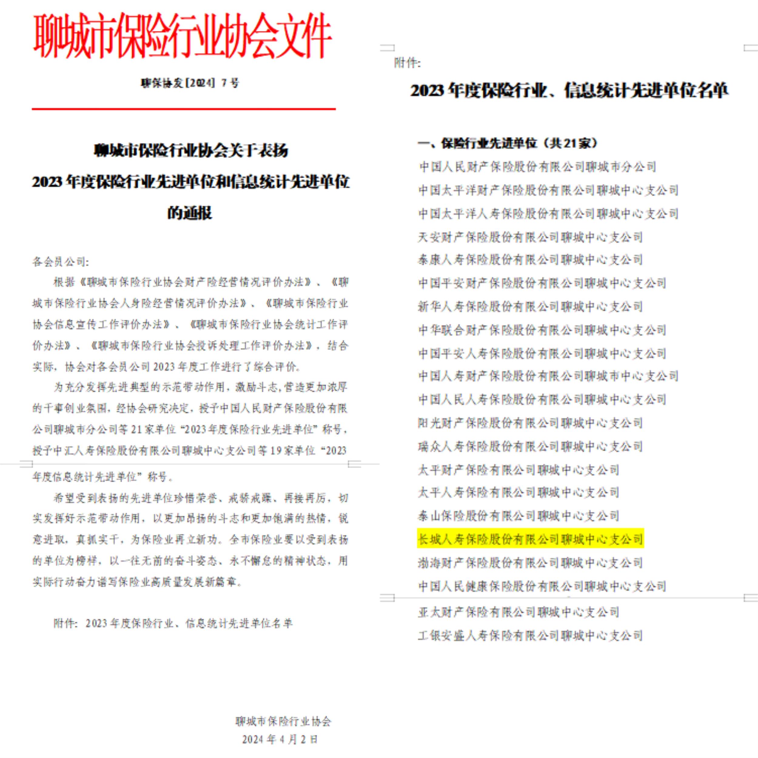 新闻来源:长城人寿    日期:2024-04-15        4月11日,聊城市保险行业协会召开“2023年度表彰大会”,长城人寿聊城中心支公司喜获殊荣,荣膺“2023年度先进单位”称号。