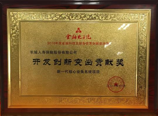 长城人寿“新一代核心业务系统项目”荣获 “2018年度金融行业开发创新突出贡献奖”