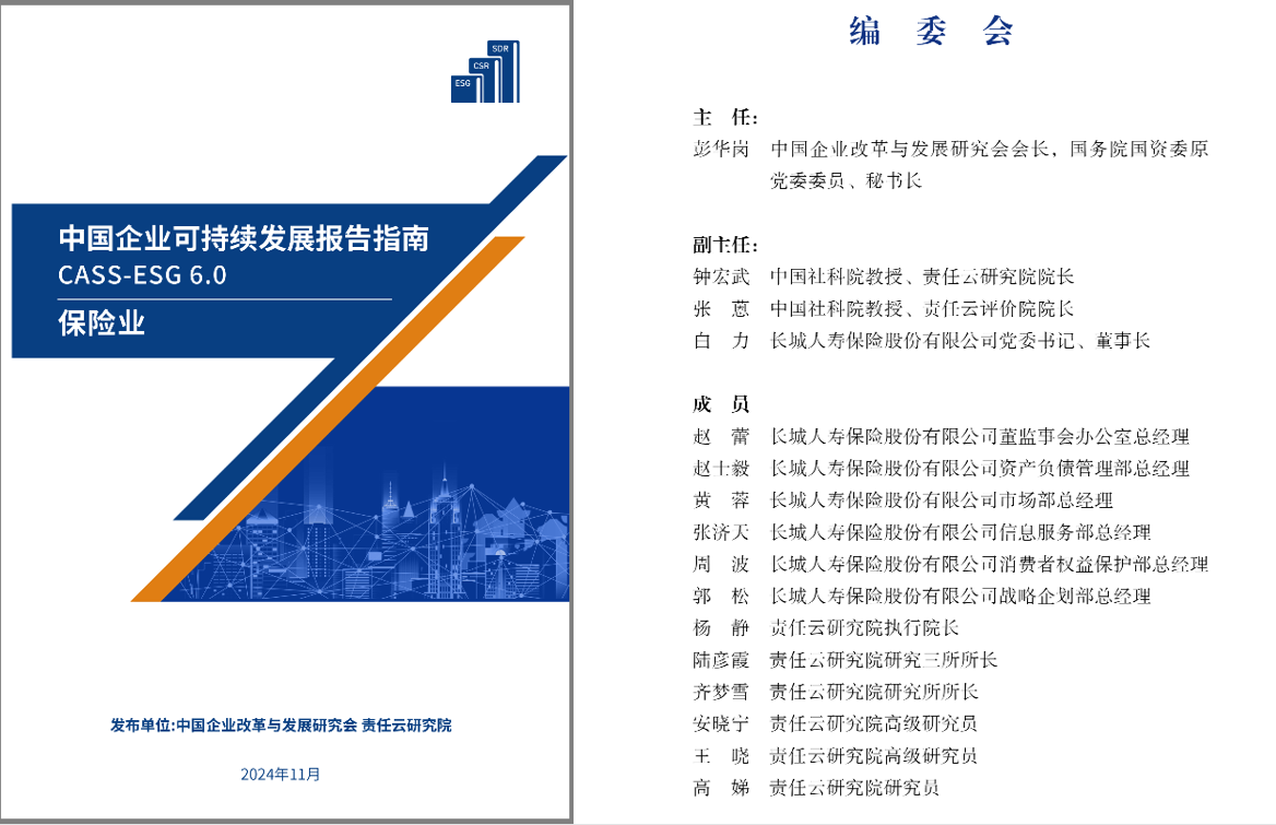 长城人寿参与编制《中国企业可持续发展报告指南CASS-ESG 6.0之保险业》并荣获“责任新秀奖”