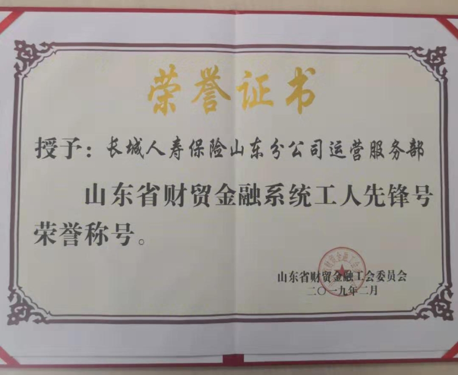 长城人寿山东分公司荣获“山东省财贸金融系统工人先锋号”称号