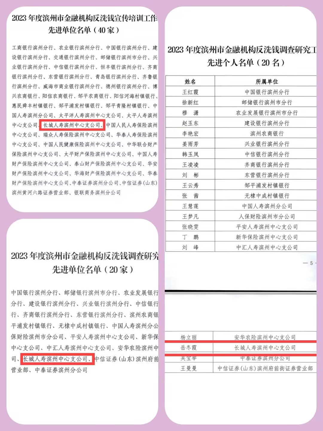 3月10日,长城人寿滨州中支获评滨州市反洗钱工作联席会议办公室授予的“2023年滨州市金融机构反洗钱调查研究工作先进单位”称号、“2023年滨州市金融机构反洗钱宣传培训工作先进单位”称号;长城人寿滨州中支洗钱管理岗岳冬霞获评“2023年滨州市金融机构反洗钱调查研究工作先进个人”称号。