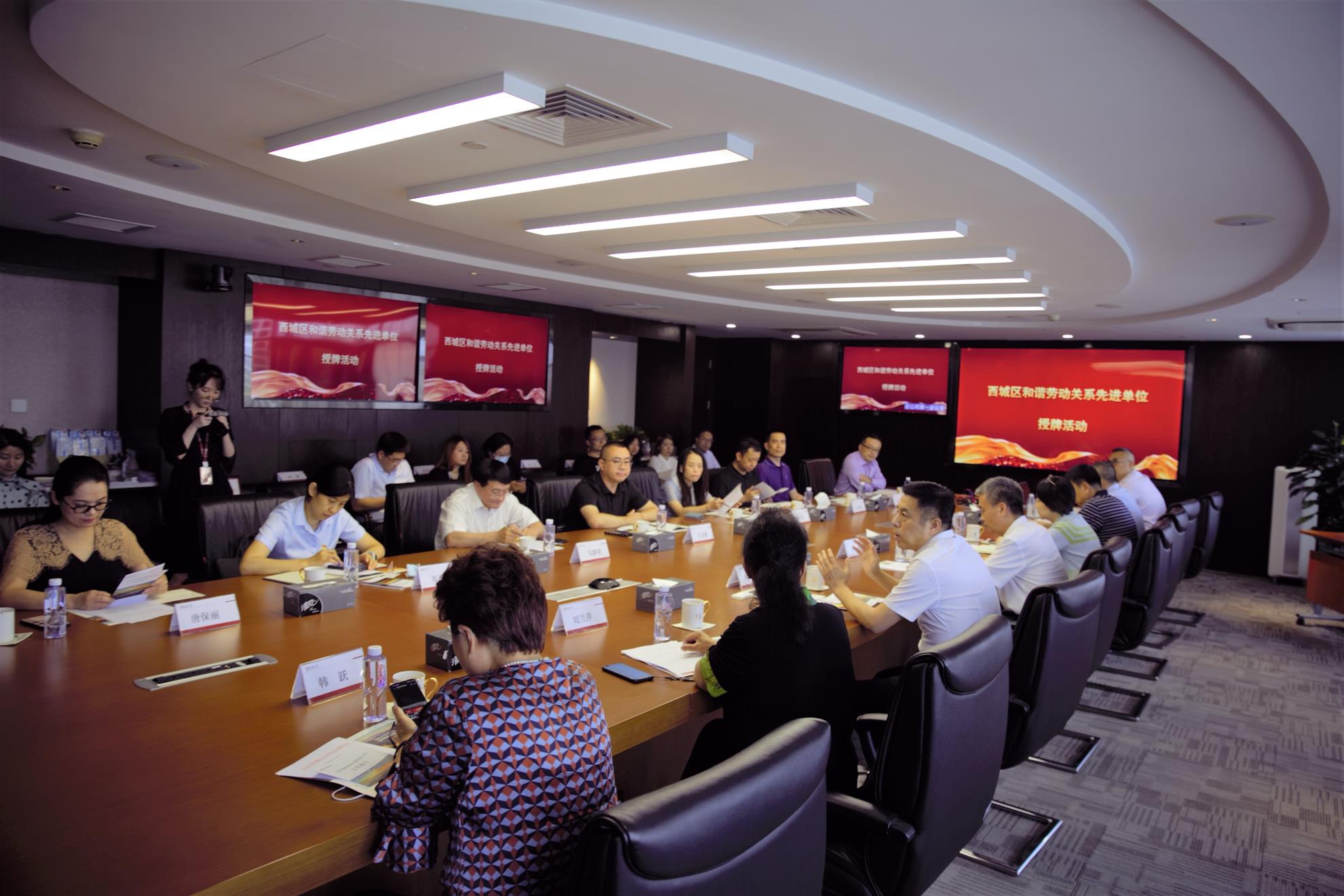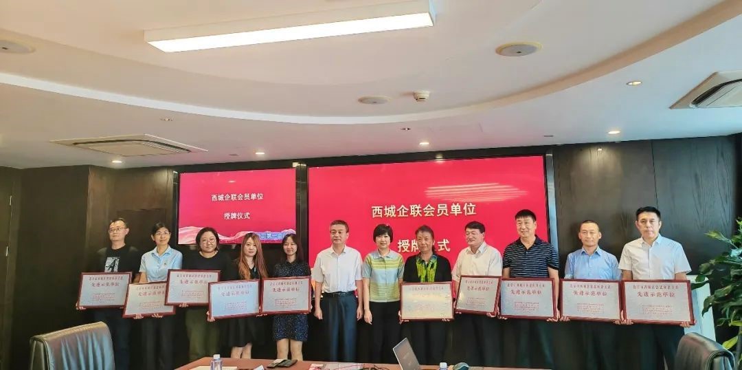 西城企联会长李书兵、执行会长程嬿琳为荣获“西城区创建和谐关系先进示范单位”的10家企业授牌。