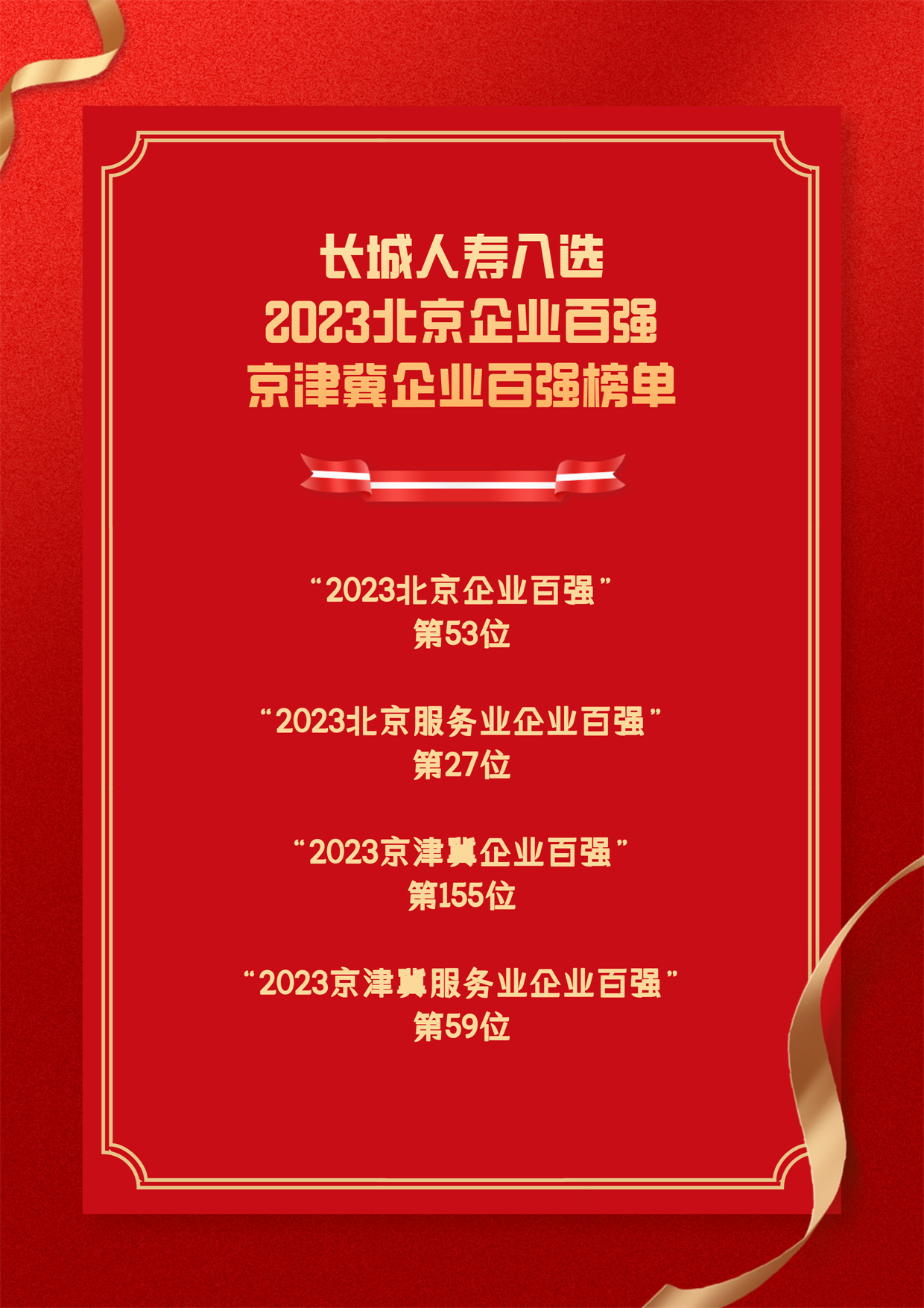 长城人寿凭借多年来在京津冀地区的经验积累和实践成果,成功入选“2023北京企业百强”(第53位)、“2023北京服务业企业百强”(第27位)、“2023京津冀企业百强”(第155位)和“2023京津冀服务业企业百强”(第59位)。