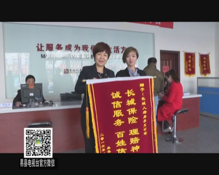 3月30日,公司客户杨女士将一面绣有“长城保险,理赔神速,诚信服务,百姓信赖”的锦旗赠予易县支公司,以表达对长城人寿快速理赔、诚信服务的感谢。易县电视台的新闻记者闻讯赶现场,记录下这感人的一幕,并于4月2日在易县电视台《易县新闻》和微信公众号“掌上易州”上进行了宣传报道。