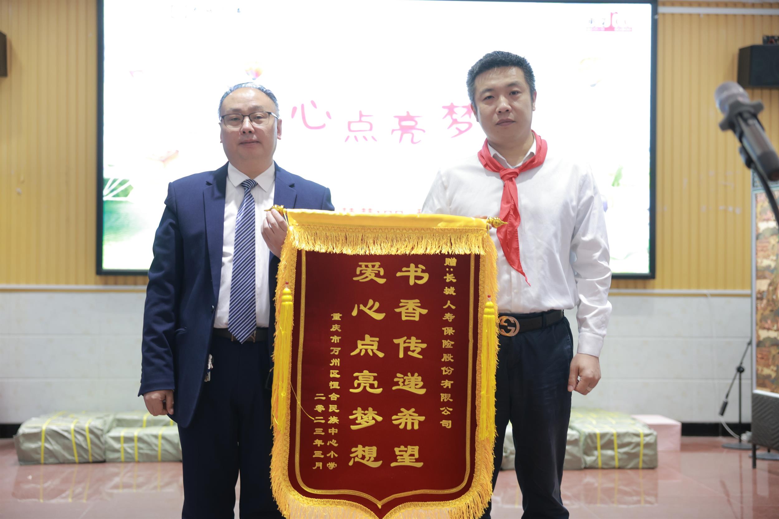 恒合民族中心小学校长代表全校师生向长城人寿回赠“书香传递希望 爱心点亮梦想”锦旗表达感激之情。