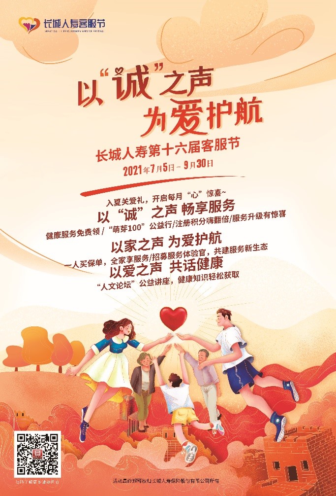 7月5日,长城人寿2021年客户服务节正式拉开帷幕。本届客服节主题为“以诚之声 为爱护航”,活动以服务客户及客户家庭为主线,聚焦健康、关爱和守护、通过由服务一个人到服务一家人的服务模式的转变,着力打造“有热度”、“有温度”的客服节,活动持续三个月,每月推出一个主题活动。
