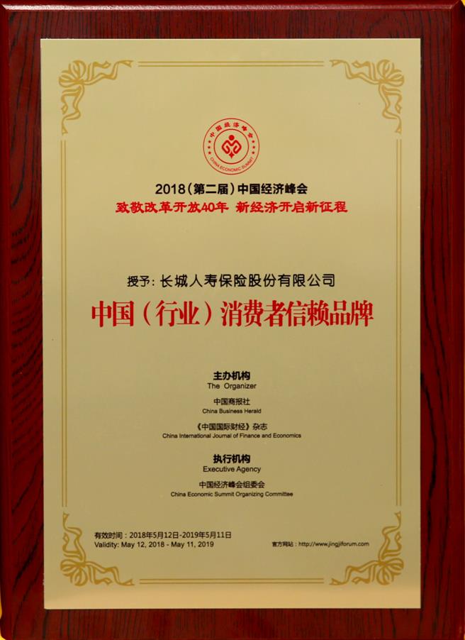 新闻来源:长城人寿    日期:2018-10-18         2018年5月11日-13日,由中国商报社、经济日报、中国国际财经杂志联合主办的“第二届中国经济峰会暨2018中国金融产业论坛”在京召开。会上,长城人寿荣获“中国(行业)消费者信赖品牌”殊荣。