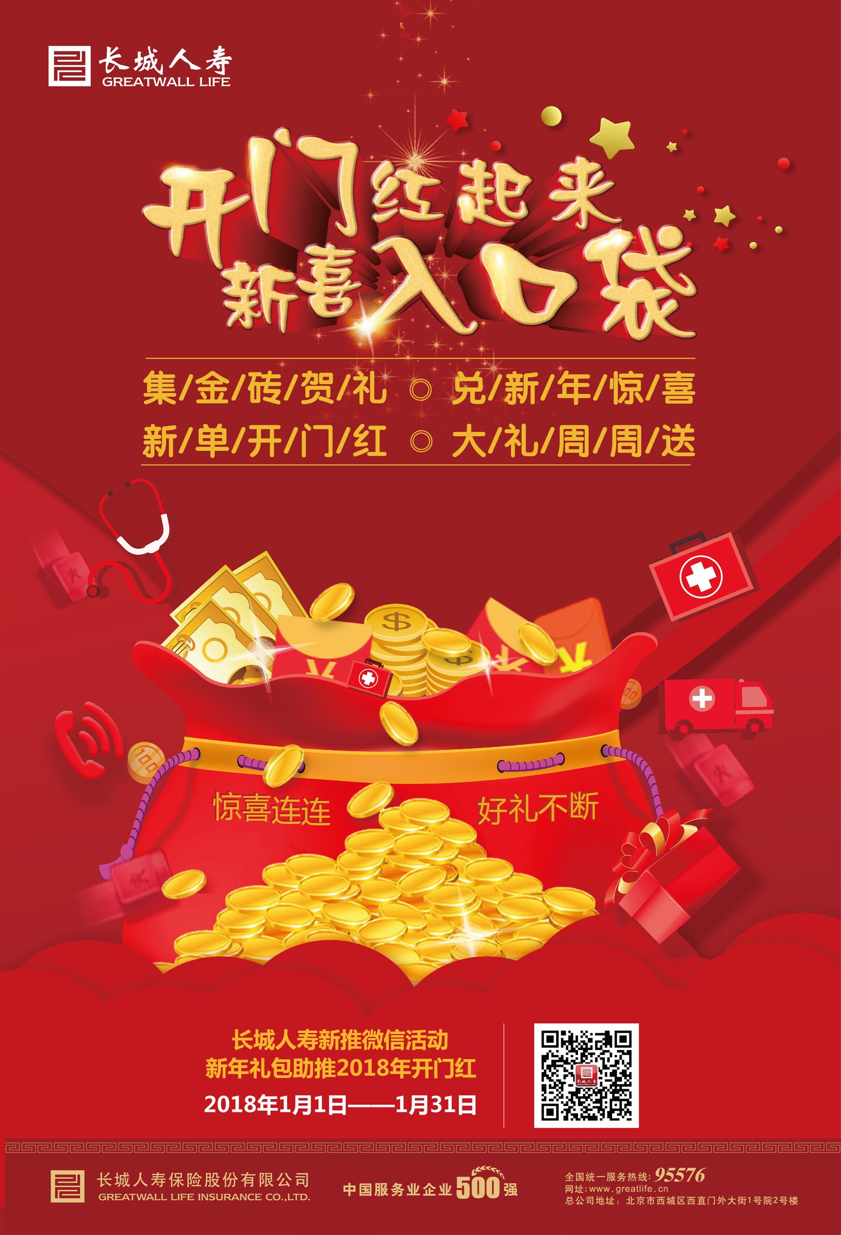 新年伊始,长城人寿官方微信将推出系列活动,倾情助力公司2018开门红。1月1日,“集金砖贺礼,兑新年惊喜”、“新单开门红,大礼周周送”两大活动率先在长城人寿官微推出,活动将从1月1日持续到1月31日。