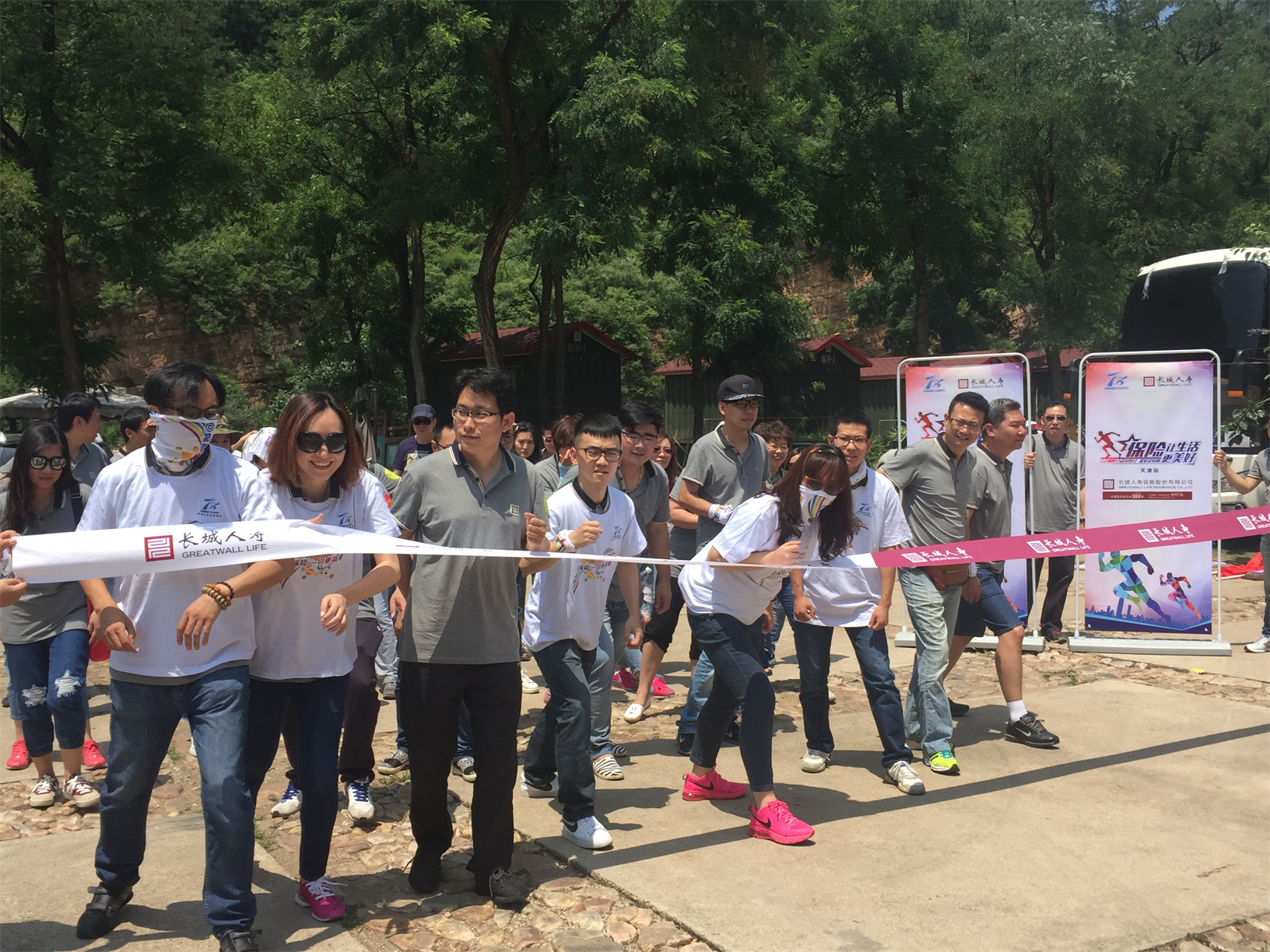 活动开始前,参跑的伙伴们跃跃欲试,佩戴"@保险 一切更简单"魔术围巾纷纷做起了热身运动。只听一声令下,长城人神采飞扬,冲出起跑线,虽然高温炎热,但丝毫不影响长城人奋勇向前的激情,大家冒着酷暑,畅快淋漓的奔跑,尽情享受跑步带来的激情与快乐。鲜艳的彩虹定位跑旗帜,喷薄而出的热情深深的感染了现场的公众,他们纷纷用掌声表达了对保险人的认可与赞许。