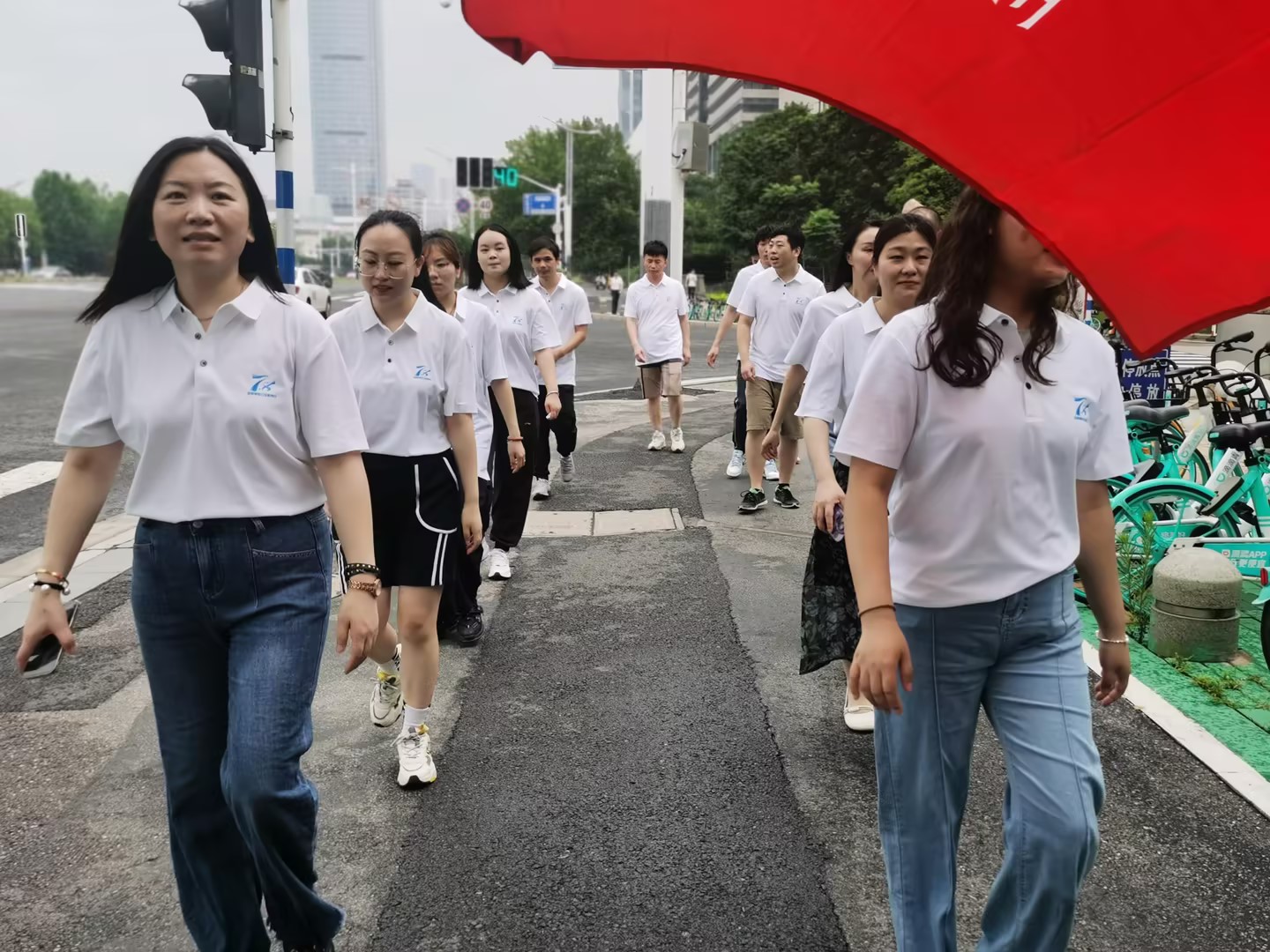 绿色环保跑。分公司全体内勤在金融城开展“唱响新征程,绿色环保跑”活动。全体人员身着7.8白色POLO衫,以饱满的精神、矫健的步伐,一路齐唱“没有共产党,就没有新中国”“团结就是力量”“打靶归来”等红歌,用歌声抒发感党恩、听党话、跟党走的决心,展现江苏长城人贯彻党的二十大精神、“奋进新征程、建功新时代”的昂扬风貌。